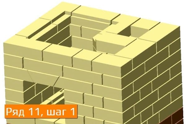 • 10 ряд. Топку присоединяют к крайнему дымоходному каналу, чтобы дым из топки направлялся в него. Для кладки необходимо 11 шт. огнеупорных кирпичей.