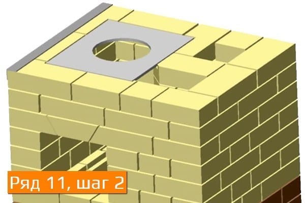 • 11 ряд. После того как ряд окончен, ступеньку на кирпичах нужно застелить слоем асбеста или глины толщиной примерно 4-5 мм. Прослойка выполняет функции подушки под варочную панель, одновременно являясь тепловым зазором. Сверху устанавливают варочную плиту. В стороне варочной камеры угол кладки усиливают металлическим уголком.