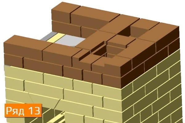 • 12 ряд. С этого ряда кладку печи делают только красным кирпичом. Закладываются стенки варочной камеры, закрывается перемычкой вертикальный дымоходный канал. Для кладки используют 10 красных кирпичей.