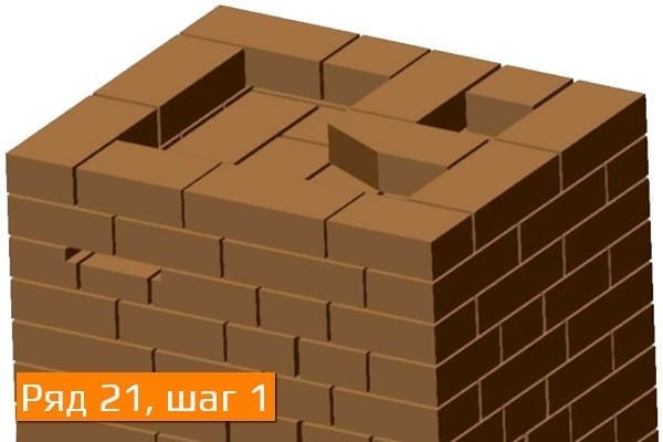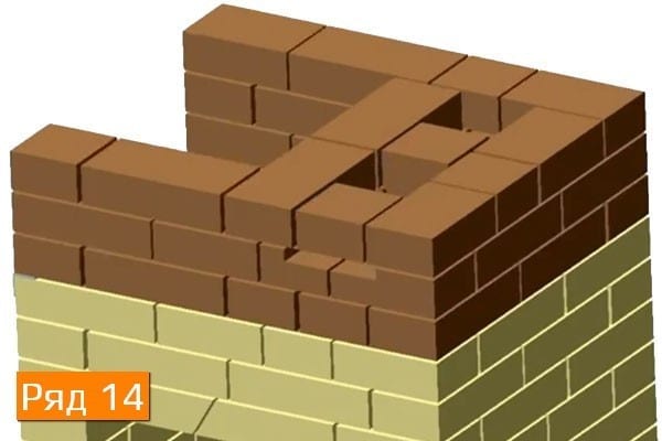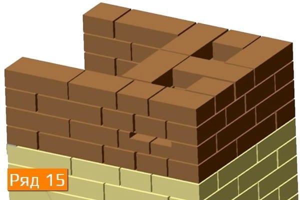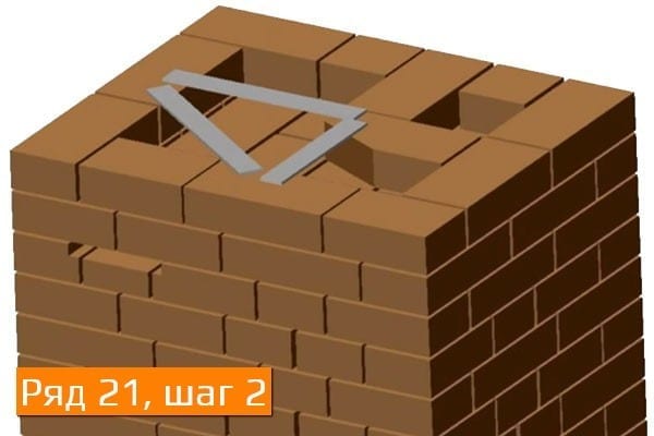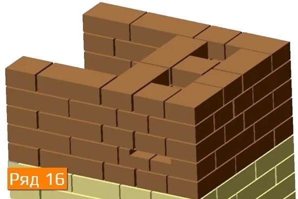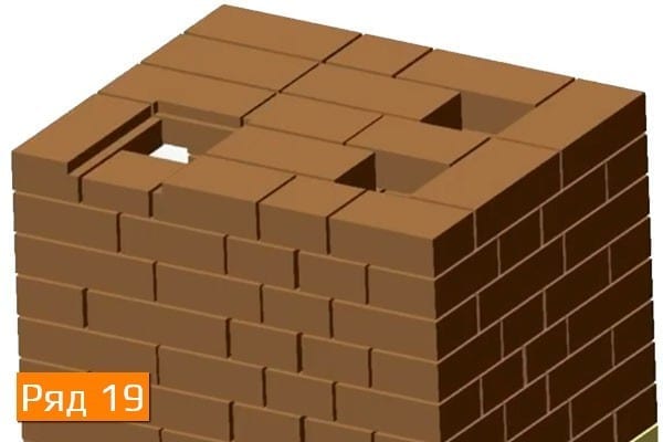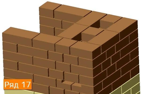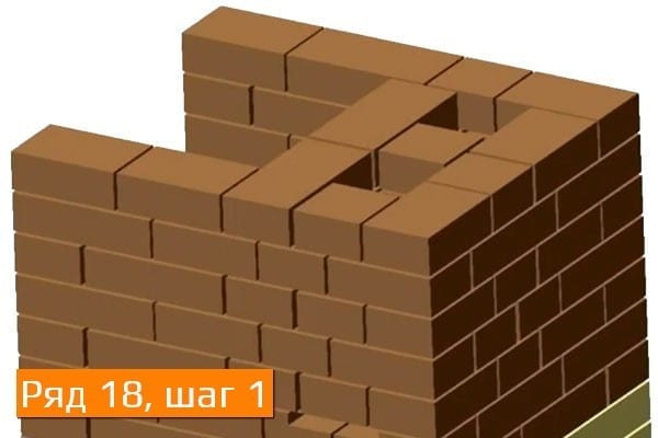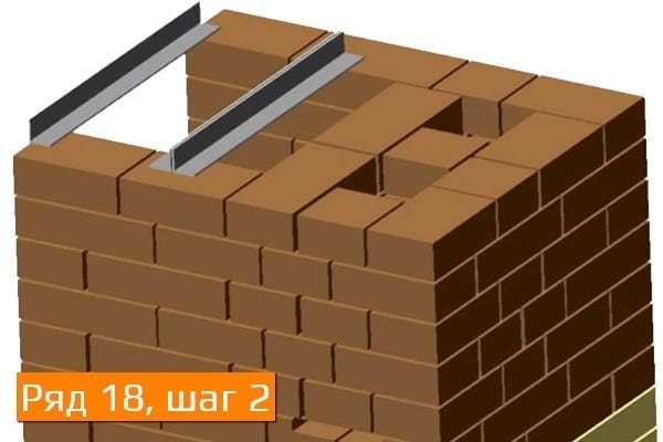 • 14-18 ряды. Продолжают формировать дымоходные каналы и варочную камеру. На 18 ряду перекрывают варочную камеру с помощью трех металлических уголков, на которые потом укладывают следующие ряды.
