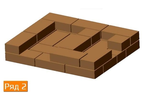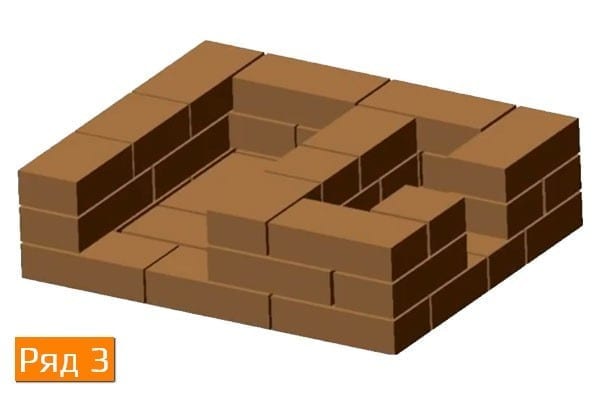 • 3 ряд. Делают по схеме. На этом ряду поднимают стенки поддувала и очистной камеры, крепят концы проволоки в швах. На третий ряд идет 13 кирпичей.