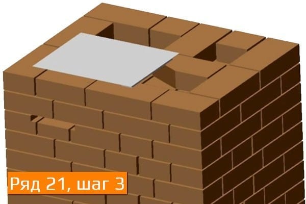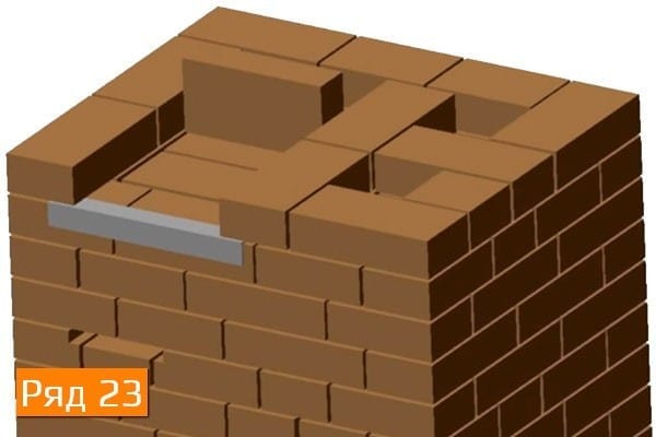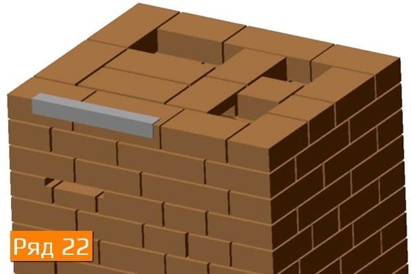 • 22 ряд. Металлическая пластина перекрывается кирпичной кладкой. Далее кладка печи производится по схеме, отверстия дымоходных каналов пока остаются открытыми.