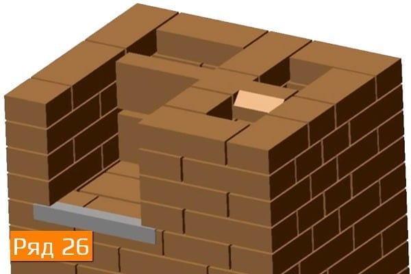 • 26 ряд. Производится подготовка обеих вертикальных каналов к объединению в один общий канал, кирпичи в обеих каналах аккуратно срезают под нужным углом. Для кладки ряда нужно 11 кирпичей.