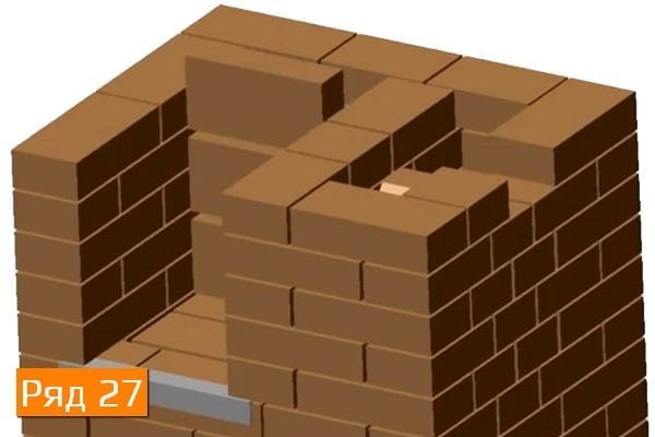 • 27 ряд. Объединяют два вертикальных канала, на получившийся общий канал монтируется дверца для прочистки. Нужно 11 кирпичей.