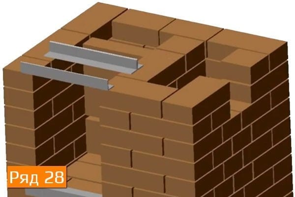• 28 ряд. Нужно 11 кирпичей. Кладка такая же, как и на предыдущем ряду.