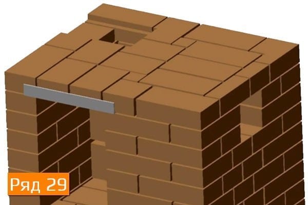 • 29 ряд. Вся площадь перекрывается кирпичом, согласно порядовке. Оставляют только отверстие над сушилкой для установки задвижки. На этот ряд требуется 17 кирпичей.