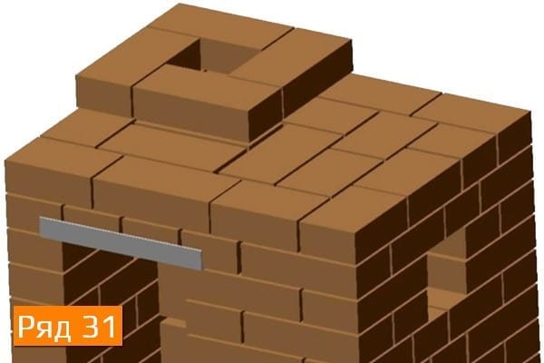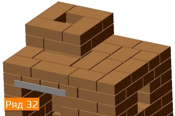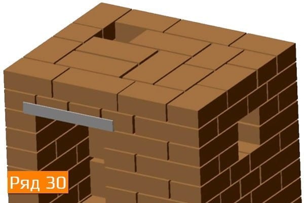 • 30 ряд. Полностью перекрывается вся поверхность печи из кирпича, за исключением дымоходного отверстия в полкирпича. Для ряда потребуется 16 кирпичей.