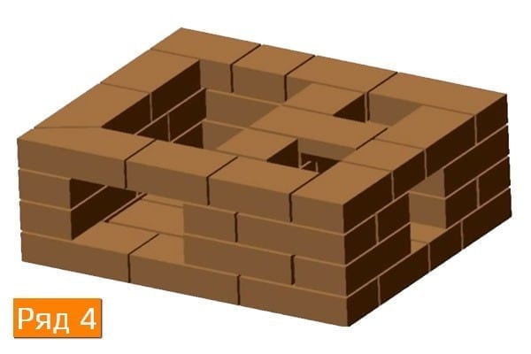 • 4 ряд. На этом ряду печи своими руками общая камера вертикального дымоходного канала делится пополам, далее два канала выкладываются отдельно. Сечение обеих каналов на всей протяжности составляет 120х80 мм. Перекрываются дверки топки и поддувала. На ряд идет 13 шт. красного кирпича.