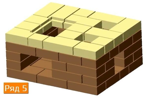 • 5 ряд. Формируется дно топки печи из кирпича, используется огнеупорный кирпич. В кирпичах, которые будут держать колосник, делают вырез. Его примерные размеры – 10х10 мм. Огнеупорные кирпичи укладываются над поддувалом. Количество кирпичей – 16 шт.