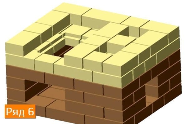На 5-м ряду также устанавливается колосник в подготовленное ранее углубление. Использование глиняного раствора для крепления колосника необязательно. Вместо раствора используют песок, формируя зазор между решеткой колосника и кирпичом – до 5 мм. - 6 ряд. Продолжают кладку печи по схеме. Поднимают стенки дымоходных каналов, закладывают стенки топочной камеры. Используется только огнеупорный кирпич в количестве 12 шт. Полостью устанавливается топочная дверка. По периметру дверцу нужно плотно обмотать асбестовым шнуром для создания теплового зазора для расширения металла.