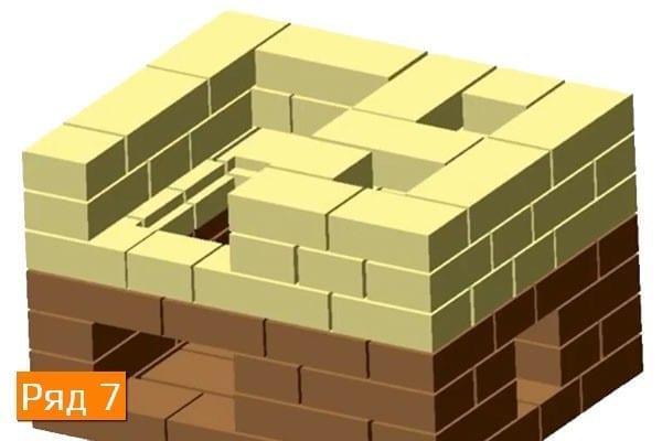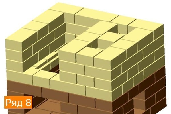 • 7, 8 ряды. Используется по 12 огнеупорных кирпича для каждого ряда. Работают согласно порядовке. Продолжают поднимать стенки топки и вертикальных дымоходных каналов.