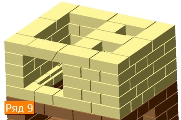 • 9 ряд. Перекрывается дверка топки. Для уменьшения нагрузки от чугунной дверки, срезают края, которые повернуты к топке под углом примерно 30º. На ряд уходит 12 шт. кирпичей.